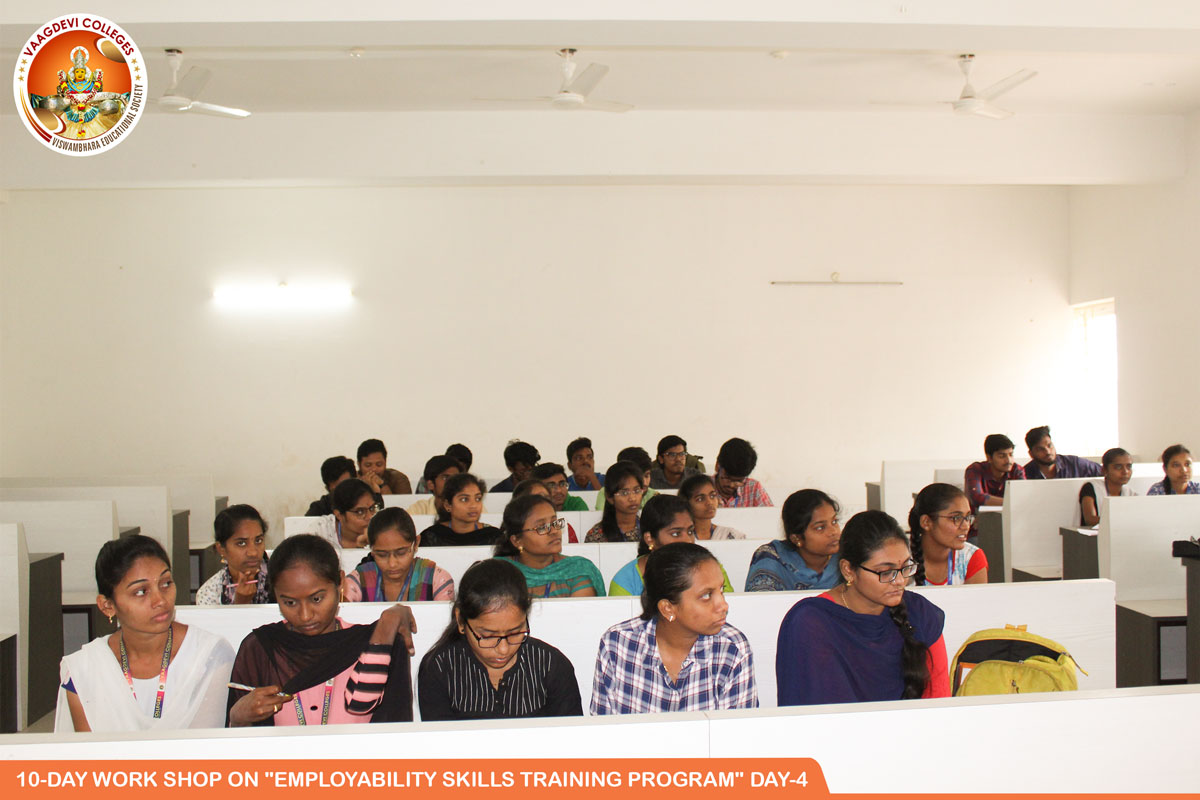 Posted in Vaagdevi 10 DAYS WORKSHOP ON “EMPLOYABILITY SKILLS TRAINING PROGRAM” DAY-4 Posted by admin Posted on January 25, 2020 Students train towards building blocks for success by learning workplace skills, attitudes and cultures on day 4 of the ongoing 10-day-“Employability Skills Training Program”