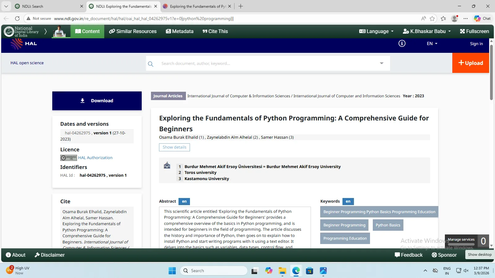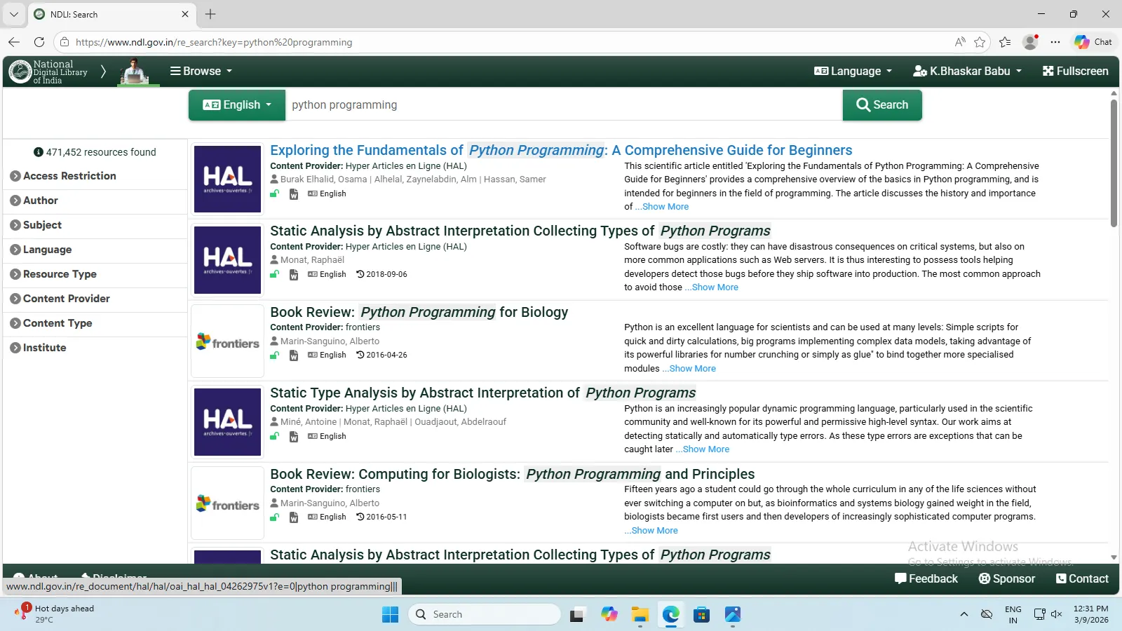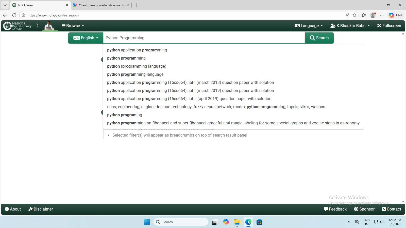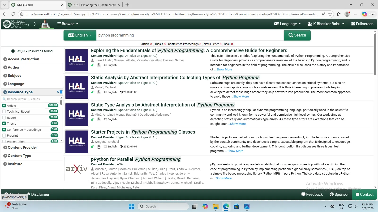 National Digital Library of India (NDLI) is a virtual repository of learning resources which is not just a repository with search and browse facilities but also provides a host of services for the learner community. It is sponsored and mentored by the Ministry of Education, Government of India, through its National Mission on Education through Information and Communication Technology (NMEICT). Filtered and federated searching is employed to facilitate focused searching so that learners can find the right resource with least effort and in minimum time.