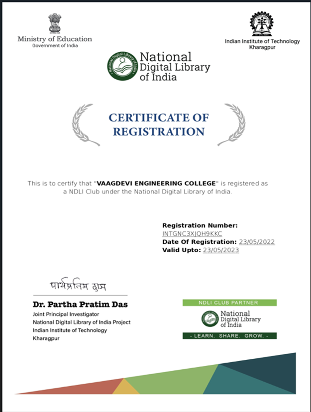 Vaagdevi Engineering College is one of the leading engineering colleges in Warangal and established its library in the year 2008. The NDLI Club was formed in the year 2022 to enhance the e-learning resources available in the library. An Awareness cum Induction Programme was conducted for students and staff members to introduce the benefits of the National Digital Library of India.
