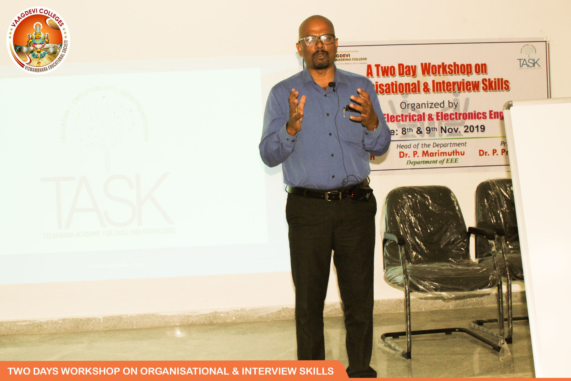 Final year EEE students get coached from 8th-9th Nov 2019 for interview competency, techniques to curb the nerves and ability to deliver organisational goals in ‘Organisational Interview Skills’ a two days workshop delivered by trainer Mr G. Narender Reddy, skill development specialist and event organized by the coordinator Mr Y. Rudraiah and Dr P. Marimuthu, EEE HOD in collaboration with TASK
