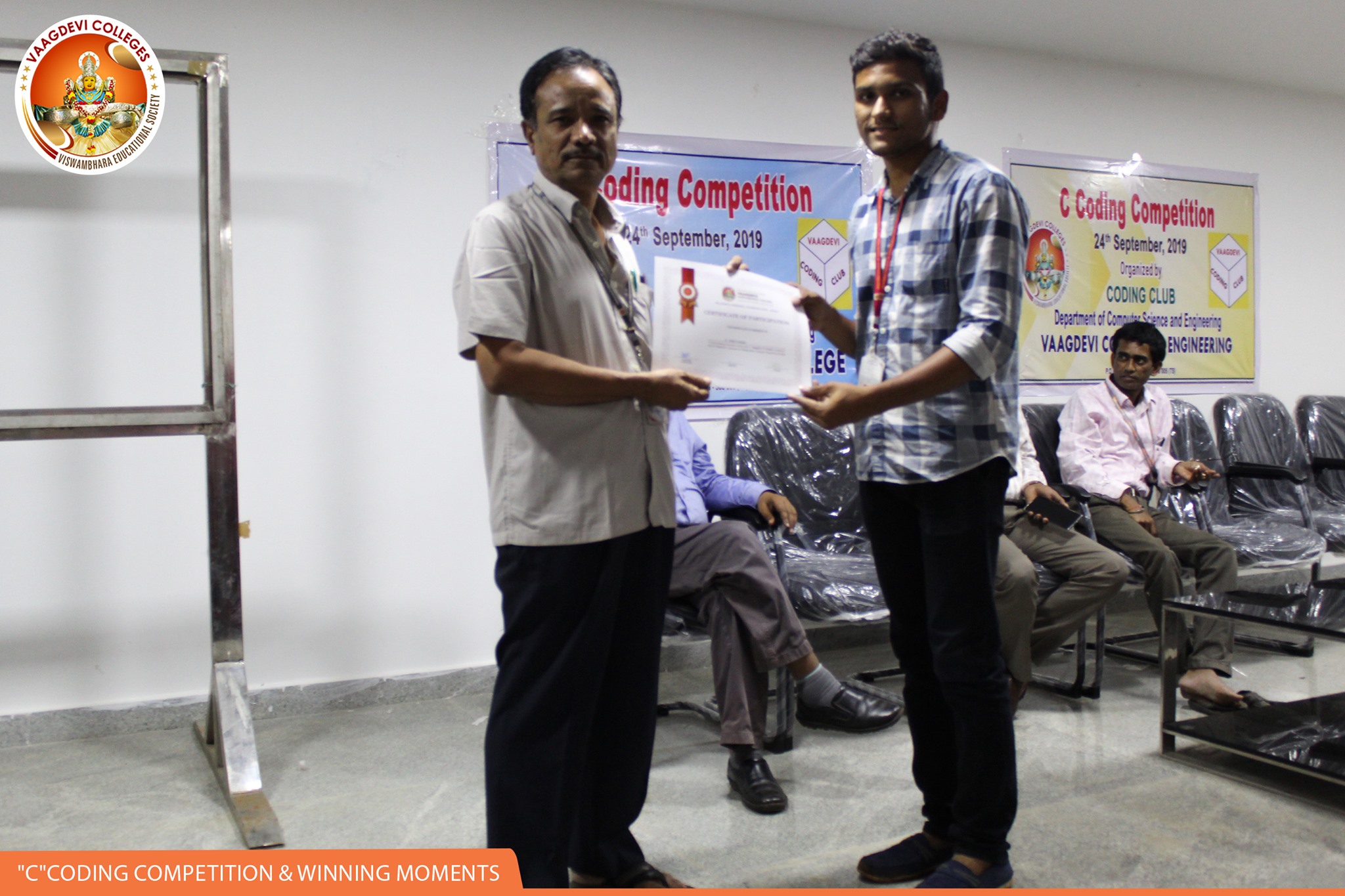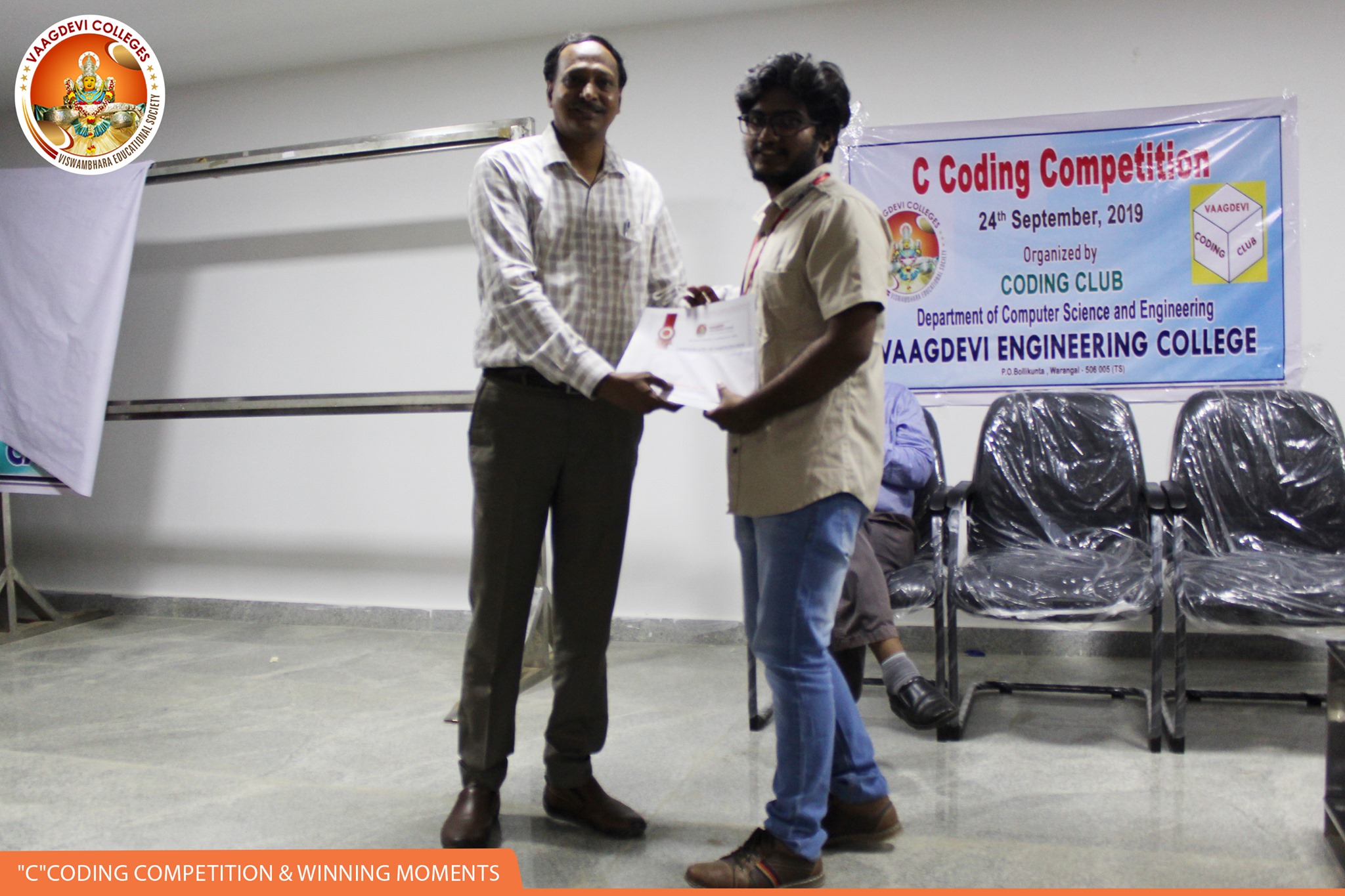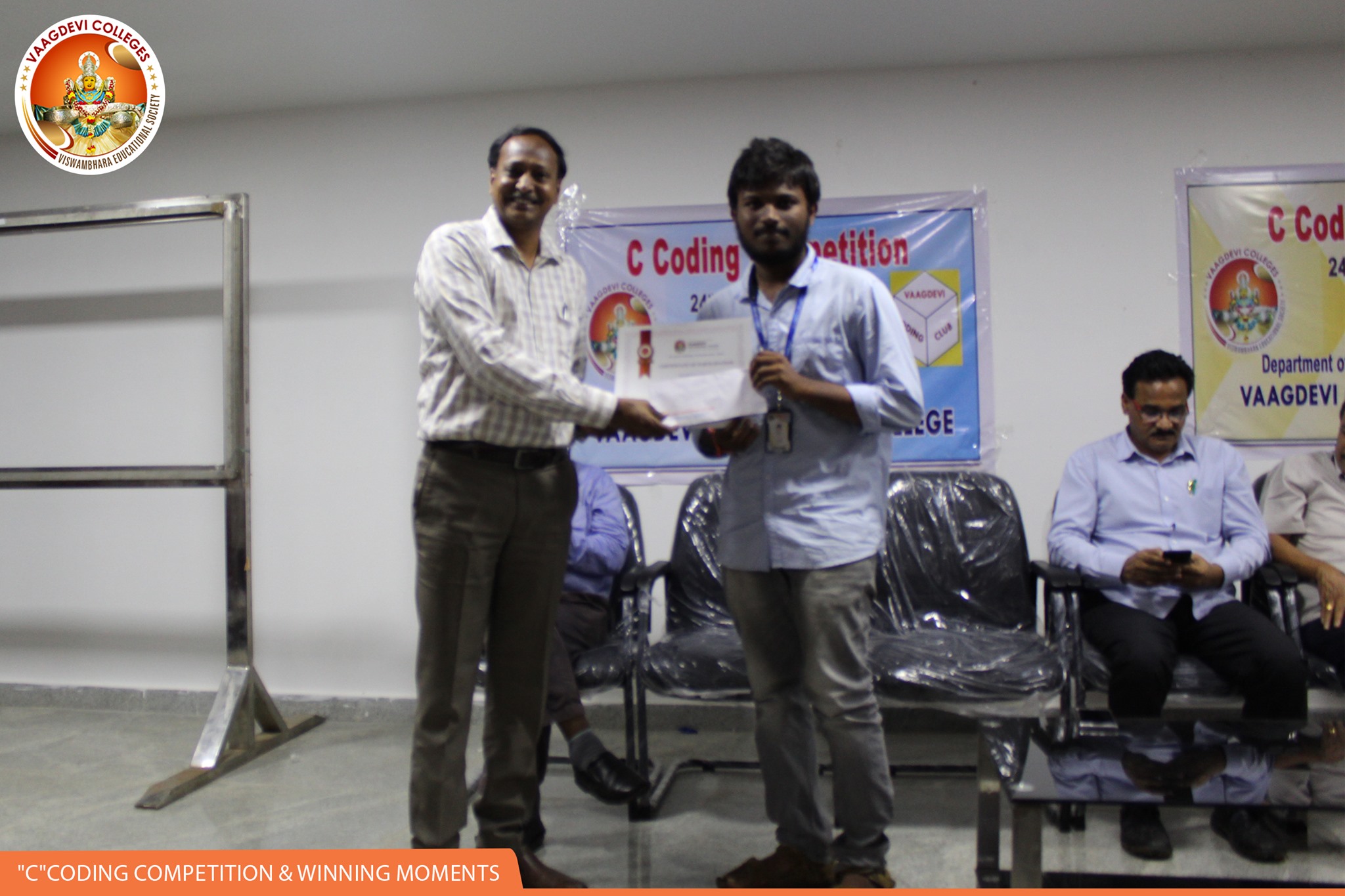 Winners announced! 85 students of VCE & VEC from all branches competed online for “Vaagdevi C Coders” competition organised by Dr E. Raju, VEC and B.Prashanth, VCE of Coding Club, Department of CSE. Congrats to our winner, R Manikanta who bagged a cash prize of Rs. 1000/-and 3 other students earned consolation prizes of Rs. 300/- each. Students received the cash prizes and participation certificates from the hands of Dr K. Prakash, Principal, VCE, DR. P. Prasad Rao, Principal, VEC, Prof. SSVN Sarma, Dean Placements, Prof. A. Chandramouli, Dean Industry Institute Interaction Cell, Prof. K. Somi Reddy, Dean BSH, Dr. V. Janaki, Head CSE,VCE, Dr. R. Navin, Head CSE, VEC, in the valedictory session.