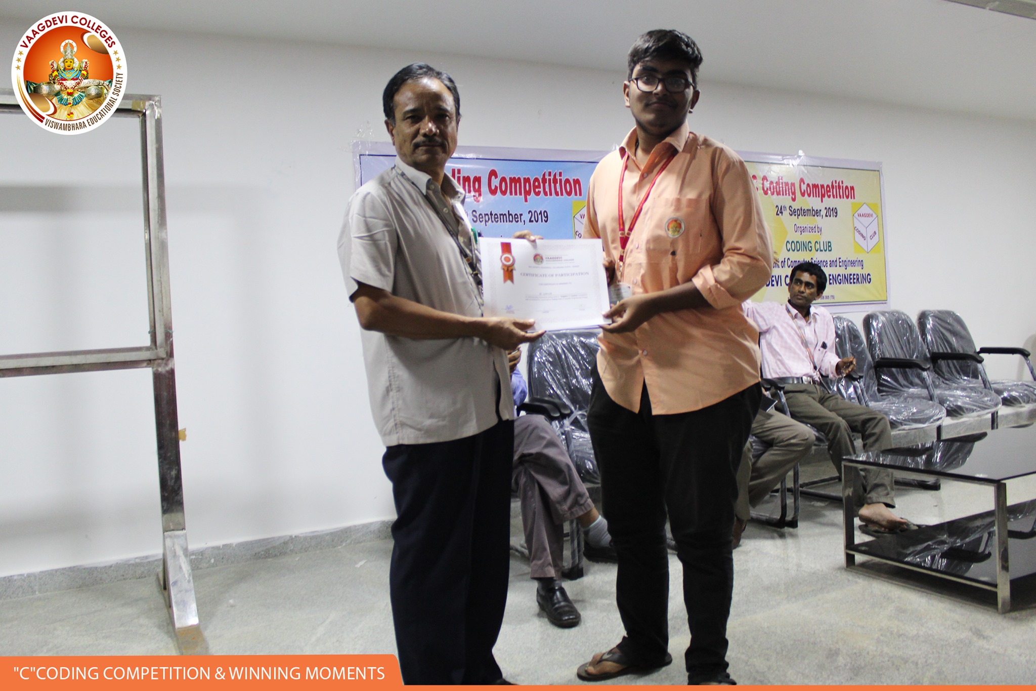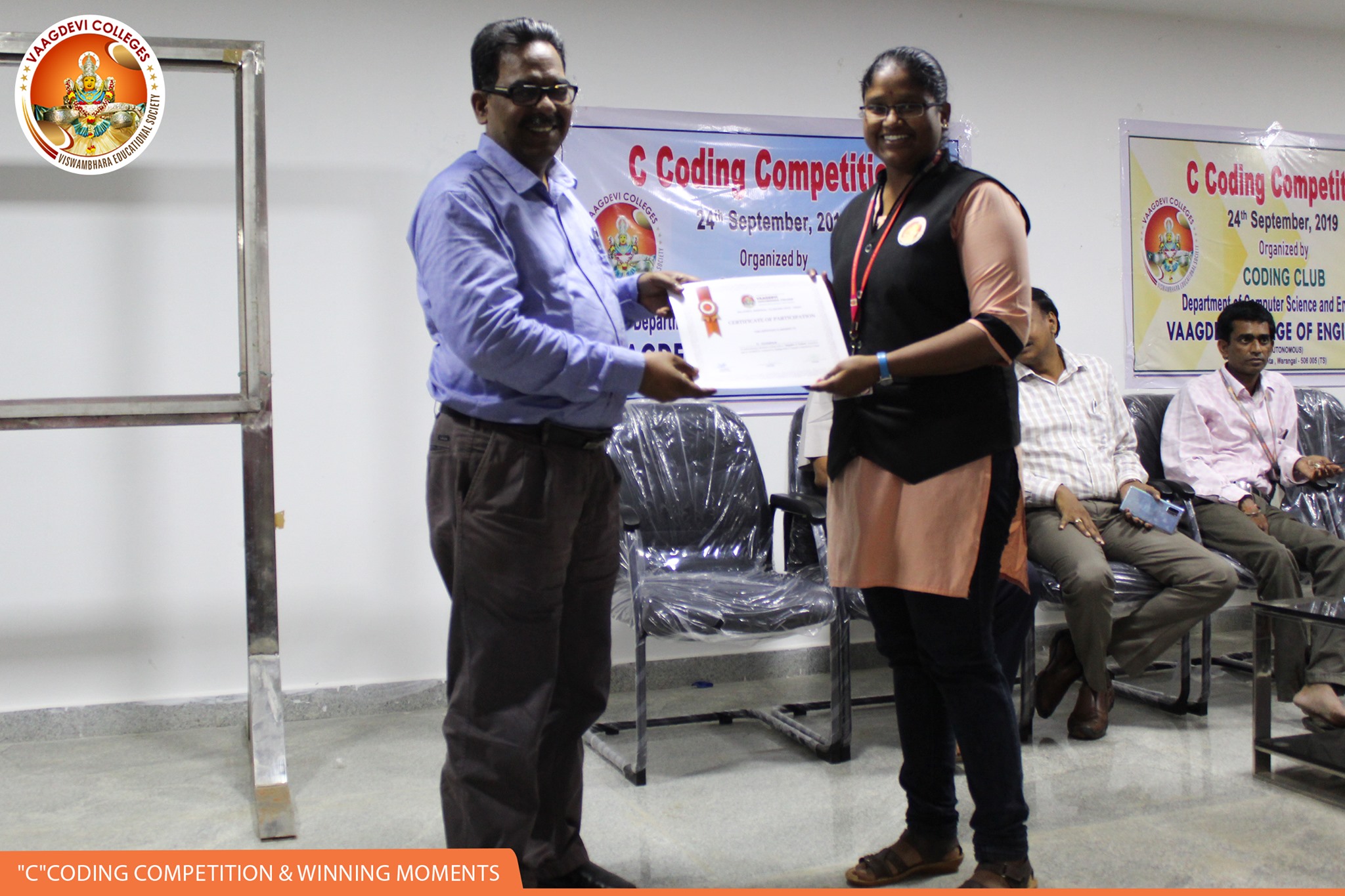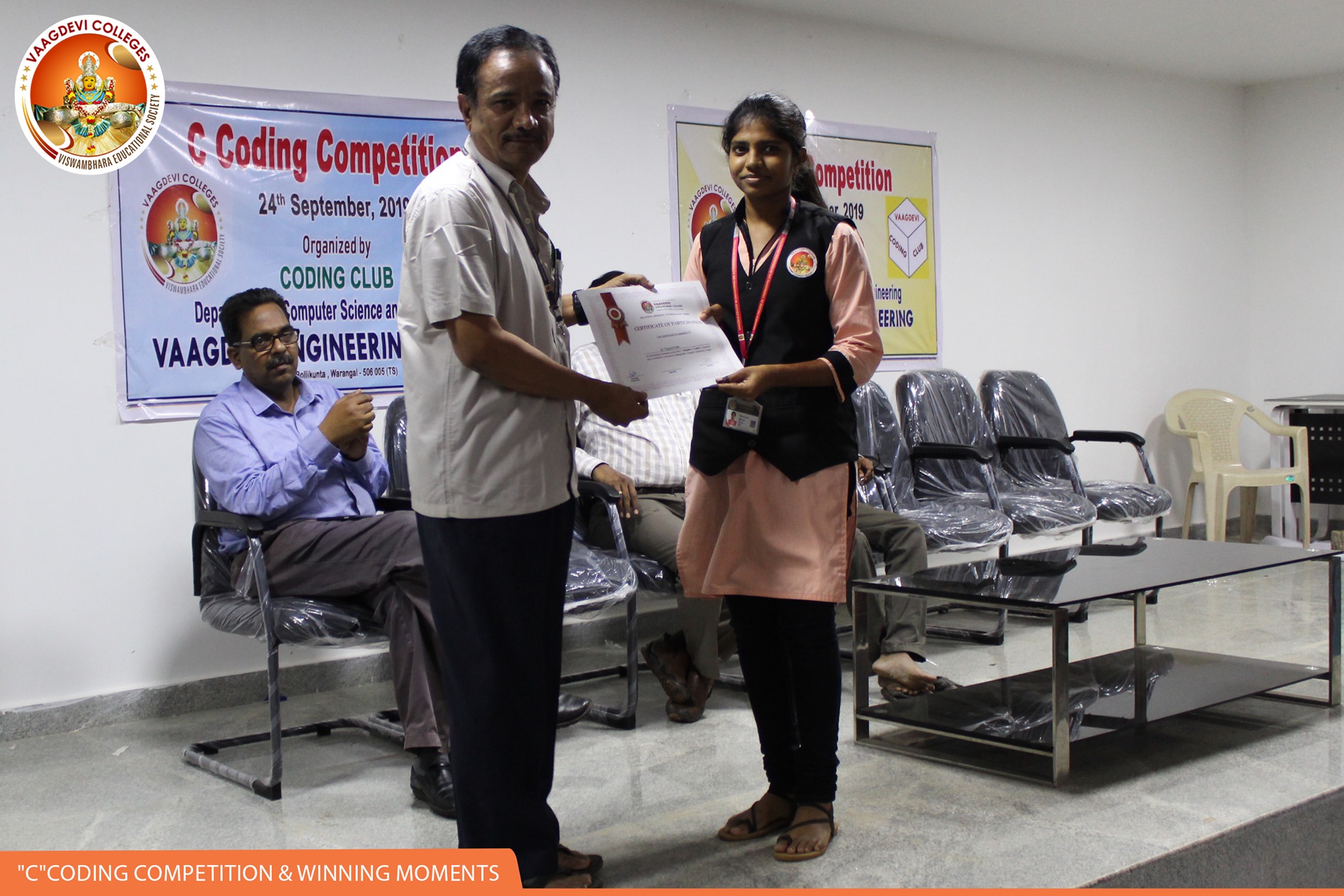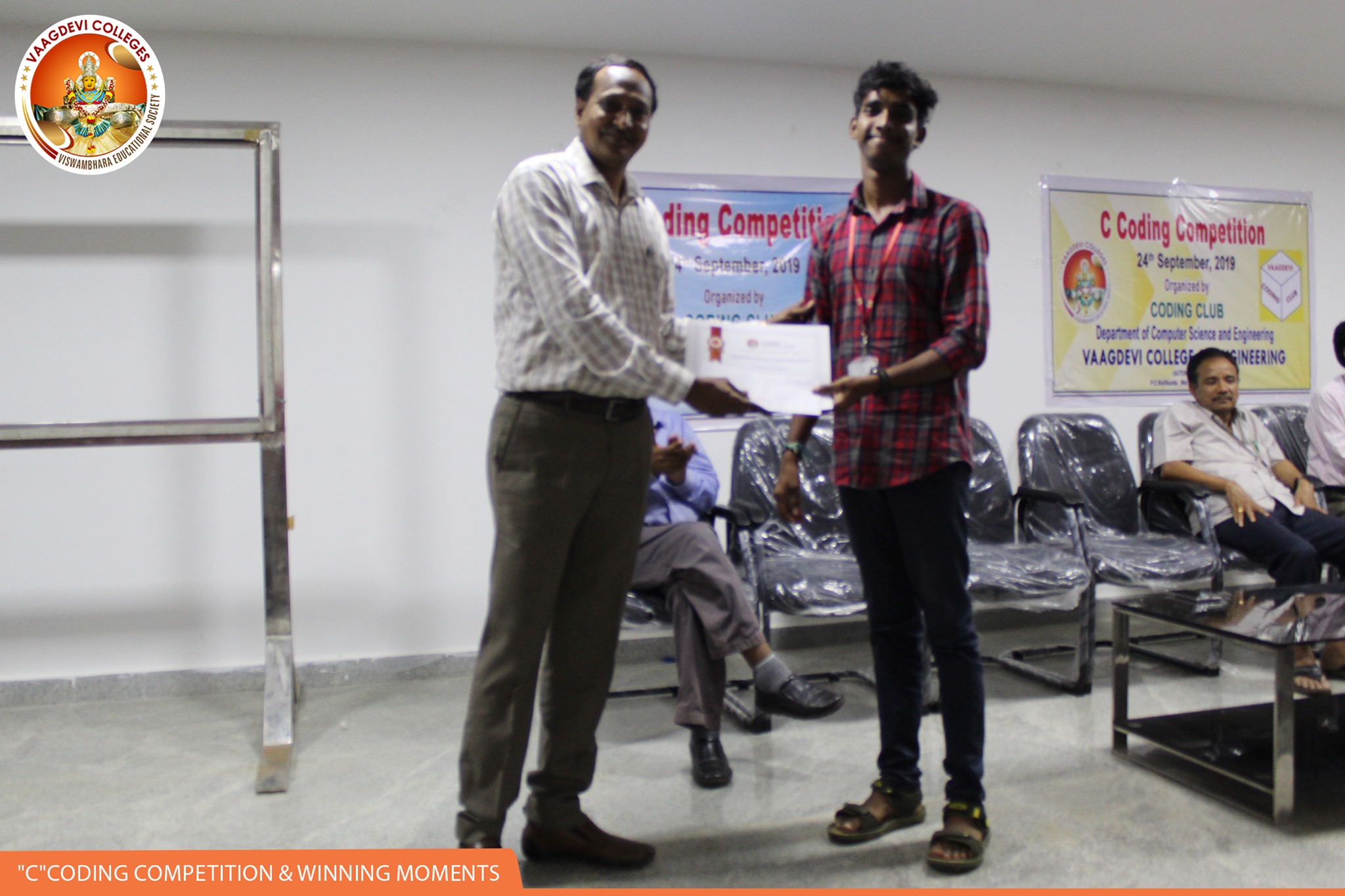 Winners announced! 85 students of VCE & VEC from all branches competed online for “Vaagdevi C Coders” competition organised by Dr E. Raju, VEC and B.Prashanth, VCE of Coding Club, Department of CSE. Congrats to our winner, R Manikanta who bagged a cash prize of Rs. 1000/-and 3 other students earned consolation prizes of Rs. 300/- each. Students received the cash prizes and participation certificates from the hands of Dr K. Prakash, Principal, VCE, DR. P. Prasad Rao, Principal, VEC, Prof. SSVN Sarma, Dean Placements, Prof. A. Chandramouli, Dean Industry Institute Interaction Cell, Prof. K. Somi Reddy, Dean BSH, Dr. V. Janaki, Head CSE,VCE, Dr. R. Navin, Head CSE, VEC, in the valedictory session.
